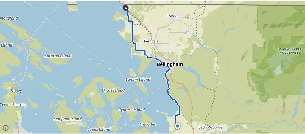 We began by cycling from our amazing AirBnB up to the Canadian border so we could “officially” start the ride. Here we had our first piece of stress, when I found I’d lost a bolt in one of my cycling shoe cleats … which meant I couldn’t get the shoe out of the pedal. Somehow, I managed not to fall off. Most remarkably, I had a spare bolt, and even knew where I’d stashed it!