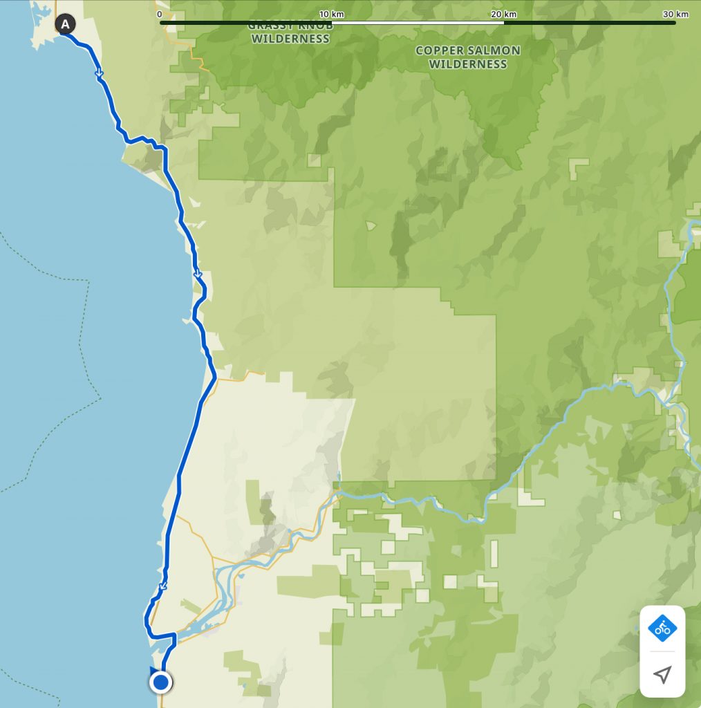All through Oregon we’ve had people come and talk to us, especially outside grocery stores. It’s as though supermarkets are a chat up place. Gold Beach was no exception and it was a pleasure to talk to a lady who basically just wanted inspiration to get out on her e-bike. I gave her plenty of encouragement.