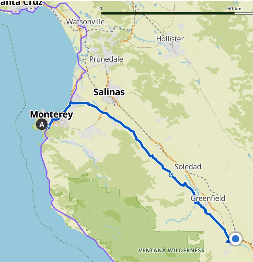 And then there were two! We had set an early alarm this morning, waking at 6am as we have a 69 mile ride to do today to get to King City – the first half of the detour around Big Sur. Cathy had just landed at Heathrow when our alarm went off. The morning started grey, with mist swirling through the trees at the cottage. We were ready in record time, and after a breakfast of waffles and porridge we headed off at 8:20. There’s an initial climb of 200’ to the top of the forest, then 700’ descent to sea level in Monterey. We glimpsed the sea and then turned north along the coast, following a trail which will take us inland. We heard church bells tolling, and passed a food kitchen serving hot breakfast to the homeless next to the trail – it looked delicious – with loud upbeat music playing as they ate. The day was still grey at this point with the sun’s disc occasionally visible – but at least we don’t have much headwind!