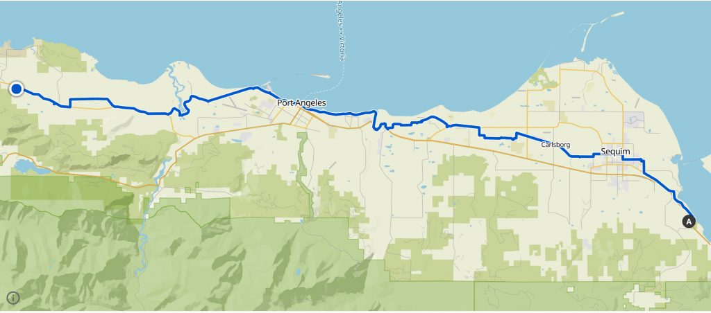 Landscape: Forest. Small communities. Valleys. Bridges. The Olympic range on our left, occasionally peeking out from the mist, later white with patches of snow. The (closed) path alongside the bay. Occasional views of the ocean with the Canadian mountains behind. Port Angeles wharf and marina.