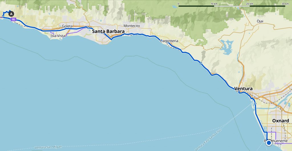 Landscape: Steep downhill through the ranch, the blue sea ahead. Along the 101, hills to the left, sea to the right, and small fields of crops where there was enough land to cultivate. The 101 was fast and busy but there was a wide shoulder. Eileen passed us in her red mini and we waved. We did an extra stretch of the 101 to avoid riding the wrong way along the other carriageway (thank you for that suggestion, Komoot). Goleta, where we stopped in the shade of a bus stop for a break, with tall palm trees, small homes on the right, hotels and businesses on the left. Goleta led into Santa Barbara, the roads on the outskirts lined with purple jacaranda trees in full flower and dark pink bougainvillea. Smart, upmarket Santa Barbara, lots of palm trees and eateries and people out enjoying themselves. A railroad runs through it and we heard the blare of the trains but didn’t see them. From the coast we looked towards the town with tall palms against the sky and mountains behind. A beach path alongside the town. Inland under various underpasses then to our delight we were on the old 101, noisy from the new 101 beside it but we were glad to be on a quiet road. The mountains to the left were misty on top. Through Carpinteria where many people were eating outside restaurants. A path alongside the 101, hills to the left and railway line, beaches and sea to the right with areas where people were setting up barbecues and enjoying the good weather. The sun was out and the sea was turquoise. Along the coast, populated with RVs and groups enjoying a weekend trip to the seaside. A quieter road inland but with my headache I don’t remember much about it. Oxnard marina blue and pretty with many big white boats stretching into the distance.