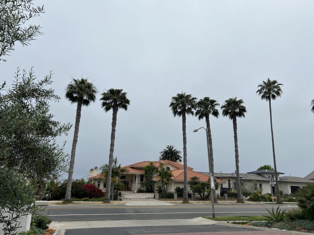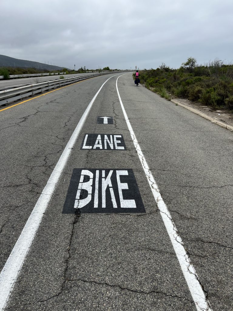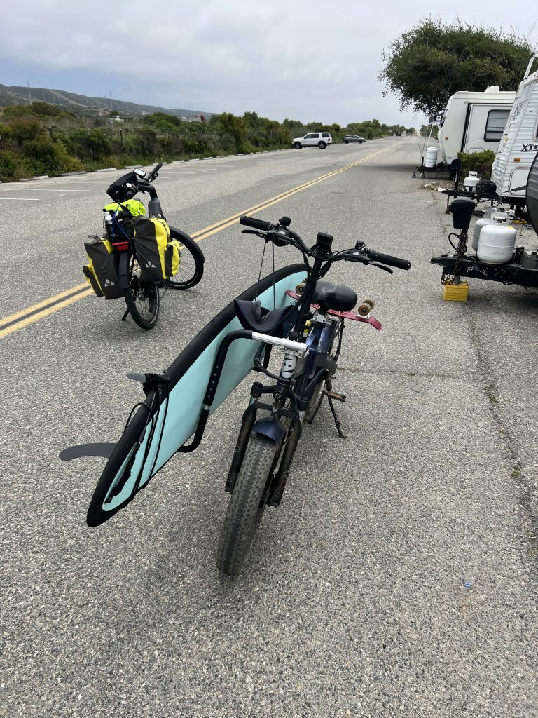 Leaving Dana Point we meandered through residential streets for a while, noticing that all the street names are Spanish now as we get closer to the border. We were passed by a few bikes carrying surf boards on frames that sit outside the cyclist’s legs – very clever! Once out of the town we stopped to make a call (during which we enjoyed a humming bird’s attention) to arrange some logistics about the bikes for when we finish the ride, then joined a cycle path running parallel to the interstate 5 freeway. Reaching a state park we found a barrier across the road and an official saying we were not allowed through on e-bikes due to a surfing competition. Liz successfully negotiated us going through with motors off, the official commenting that he hated making these big executive decisions. The surf competition was over the dunes, but is a big affair with lots of marquees and large TV screens, and loud PA systems. It turned out that we were only in the park for half a mile and then joined the old PCH, again parallel to i5 and almost completely devoid of traffic.